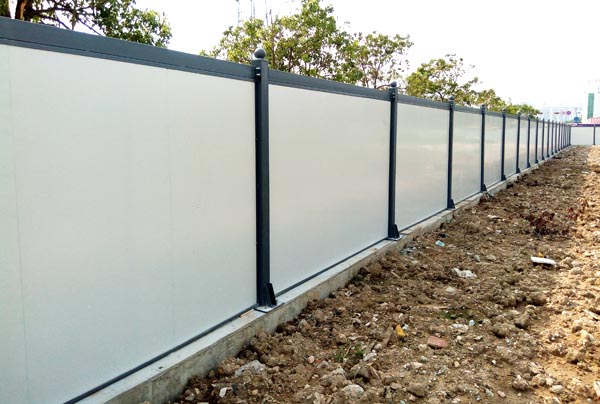 施工圍擋用白色彩鋼板作墻體,用藍色雙拼C型鋼作立柱,立柱頂部配藍色造型端蓋(可裝路燈),圍墻四周用藍色彩鋼框邊。高矮、大小、色澤一致。臟污后隨時可用水清洗擦拭。